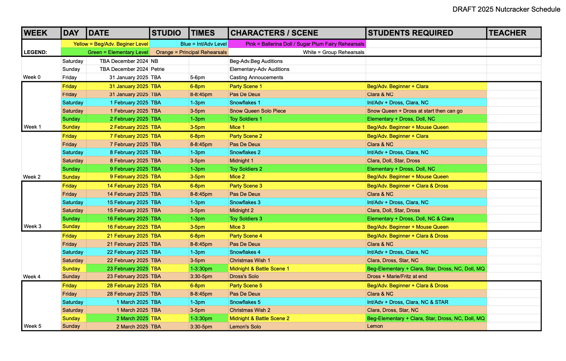 You can download the PDFs here to see schedules by dates and colours (spreadsheet) or by levels (document). Please keep in mind this is still a draft and can change based on audition numbers, acceptances of roles and teacher/studio availability.